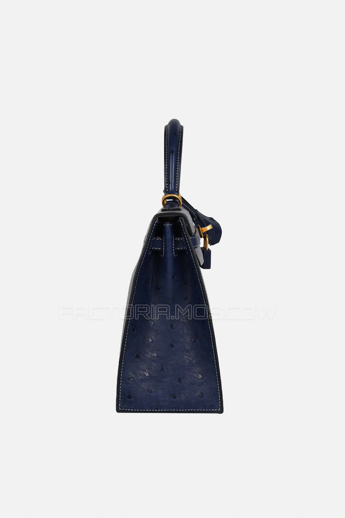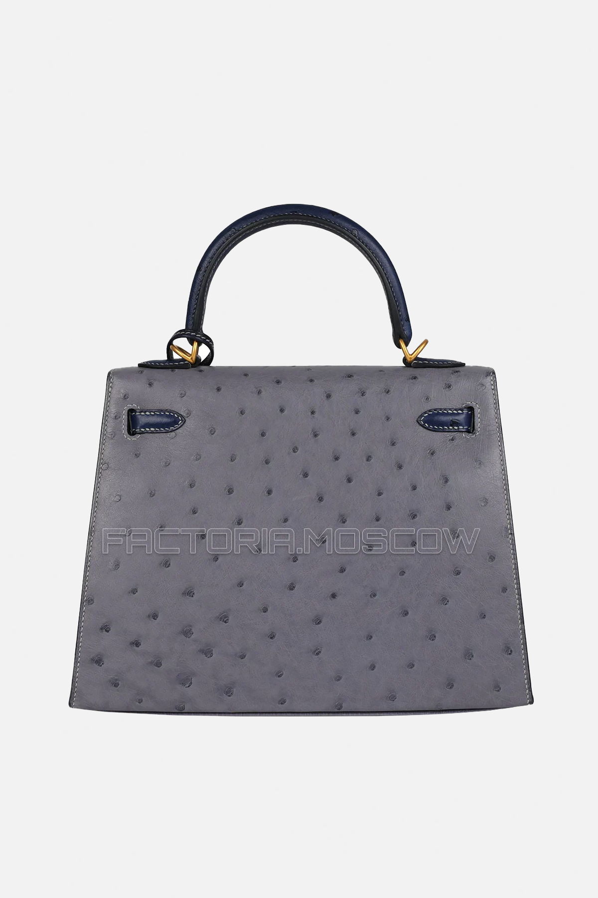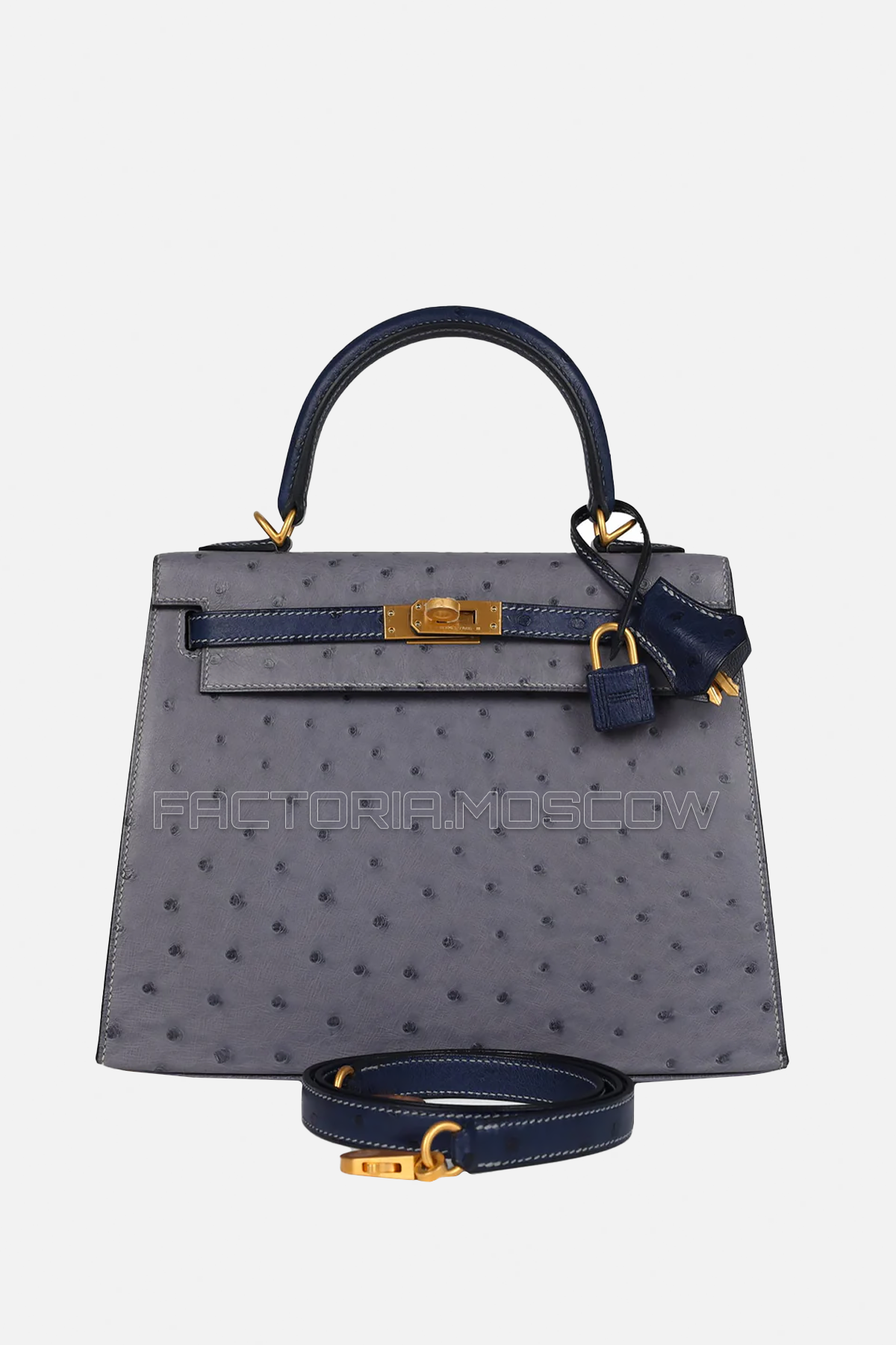 Hermès HSS Kelly Sellier 25 Gris Agate/Bleu Iris Ostrich Brushed Gold in stock and available to order in exclusive quality made from 100% original materials in a full boutique set.