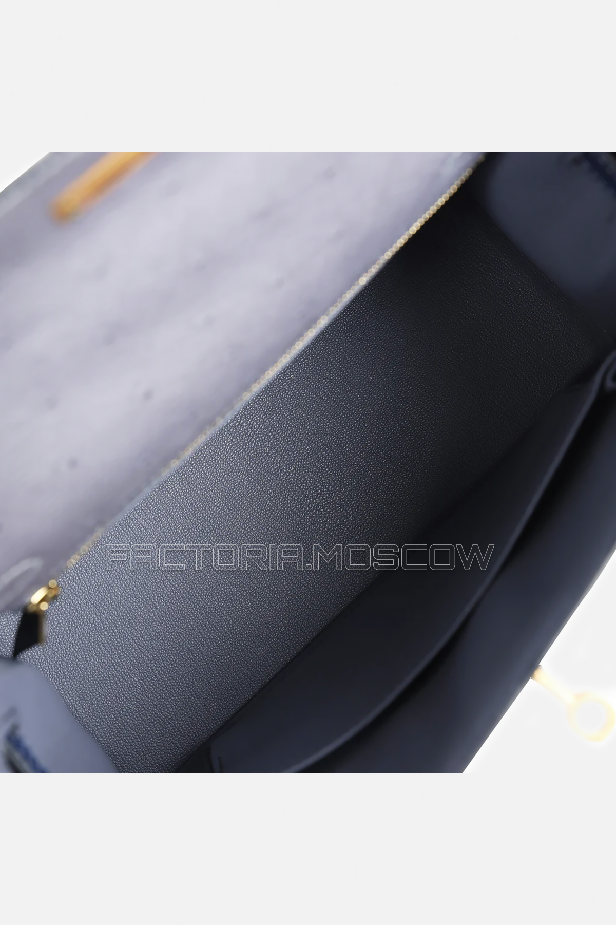 Kelly 25 Ostrich in Gris Agate/Bleu Iris will become the central element of your wardrobe, emphasizing prestige and refined taste.