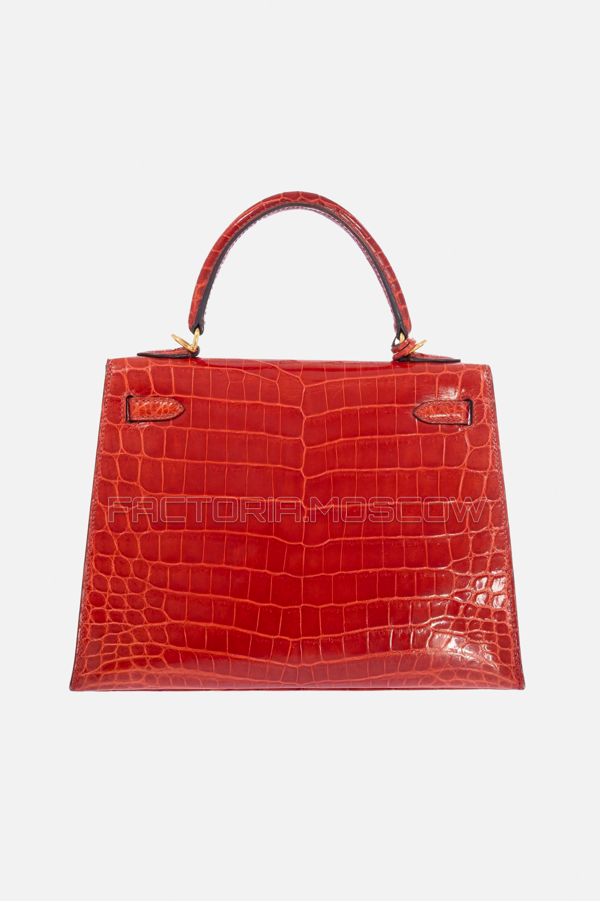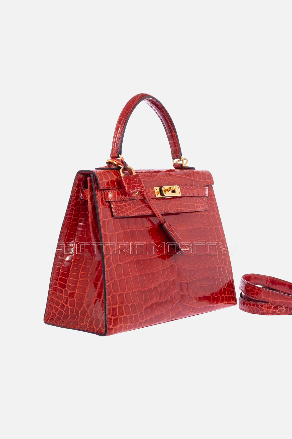 Hermès Kelly 25 Sellier Geranium Shiny Alligator GHW in stock and on order in exclusive quality from 100% original materials in a full boutique set.