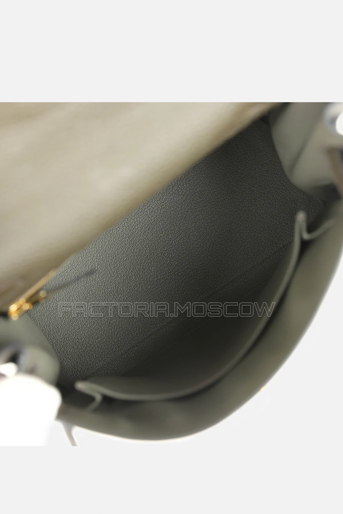 The bag is crafted from legendary Togo leather, one of the most popular and sought-after hides in the Hermès collection. Togo leather is known for its soft texture and high wear resistance, giving the bag not only a luxurious look but also durability. The Vert De Gris color, which translates from French as "green gray," is deep and versatile. This shade lends a sophisticated touch to the bag and pairs easily with a variety of clothing styles, adding a touch of class to any look.