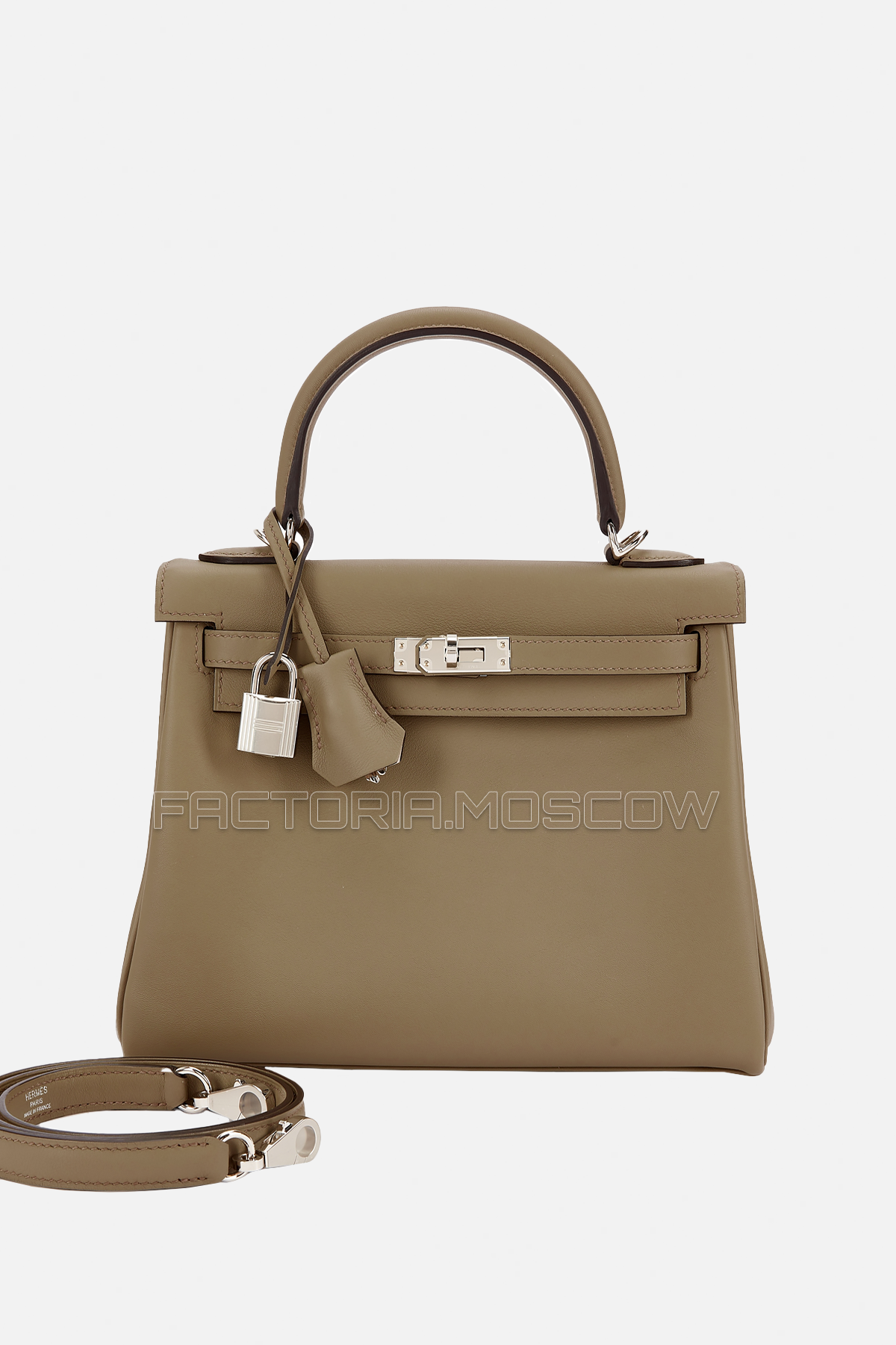 Kelly Retourne 25 в цветах Beige Marfa/Gris Pale cо съемным ремешком обеспечивает дополнительную универсальность, позволяя носить сумку на плече или в руках.