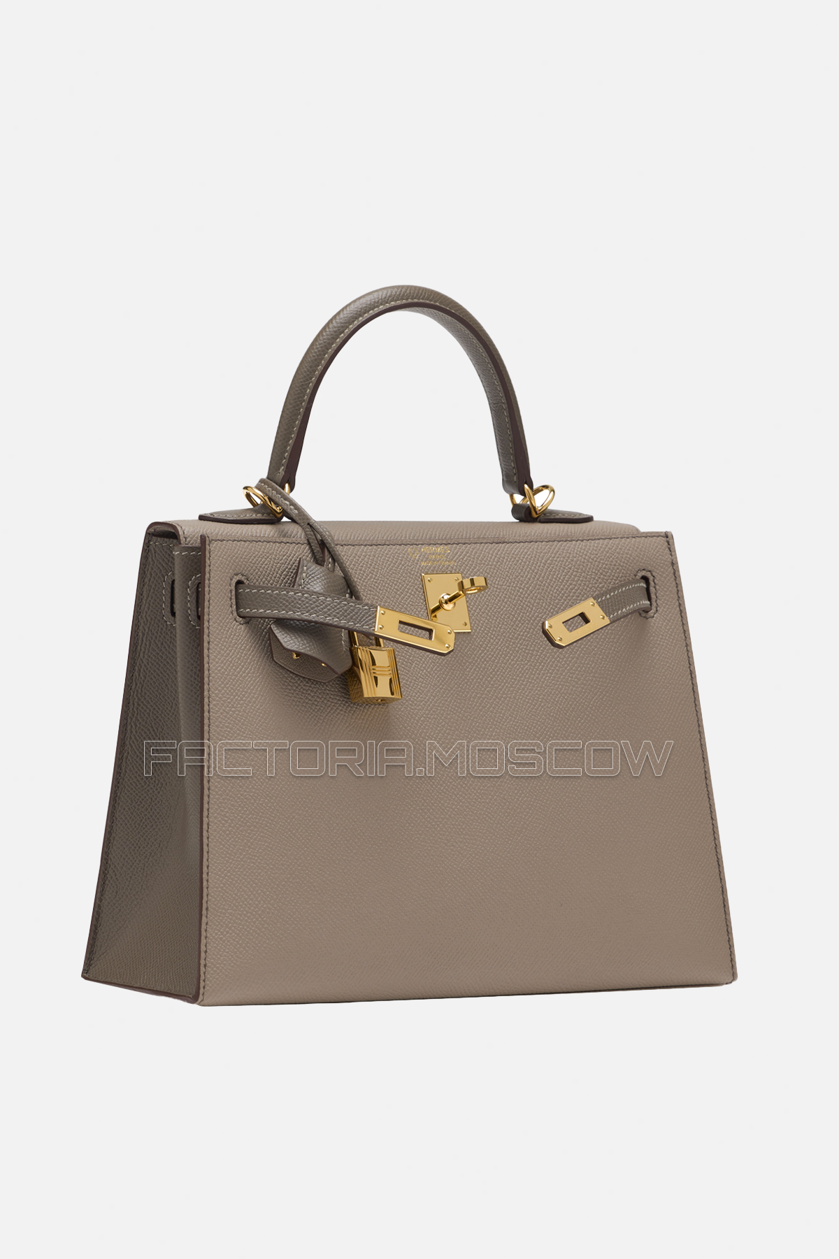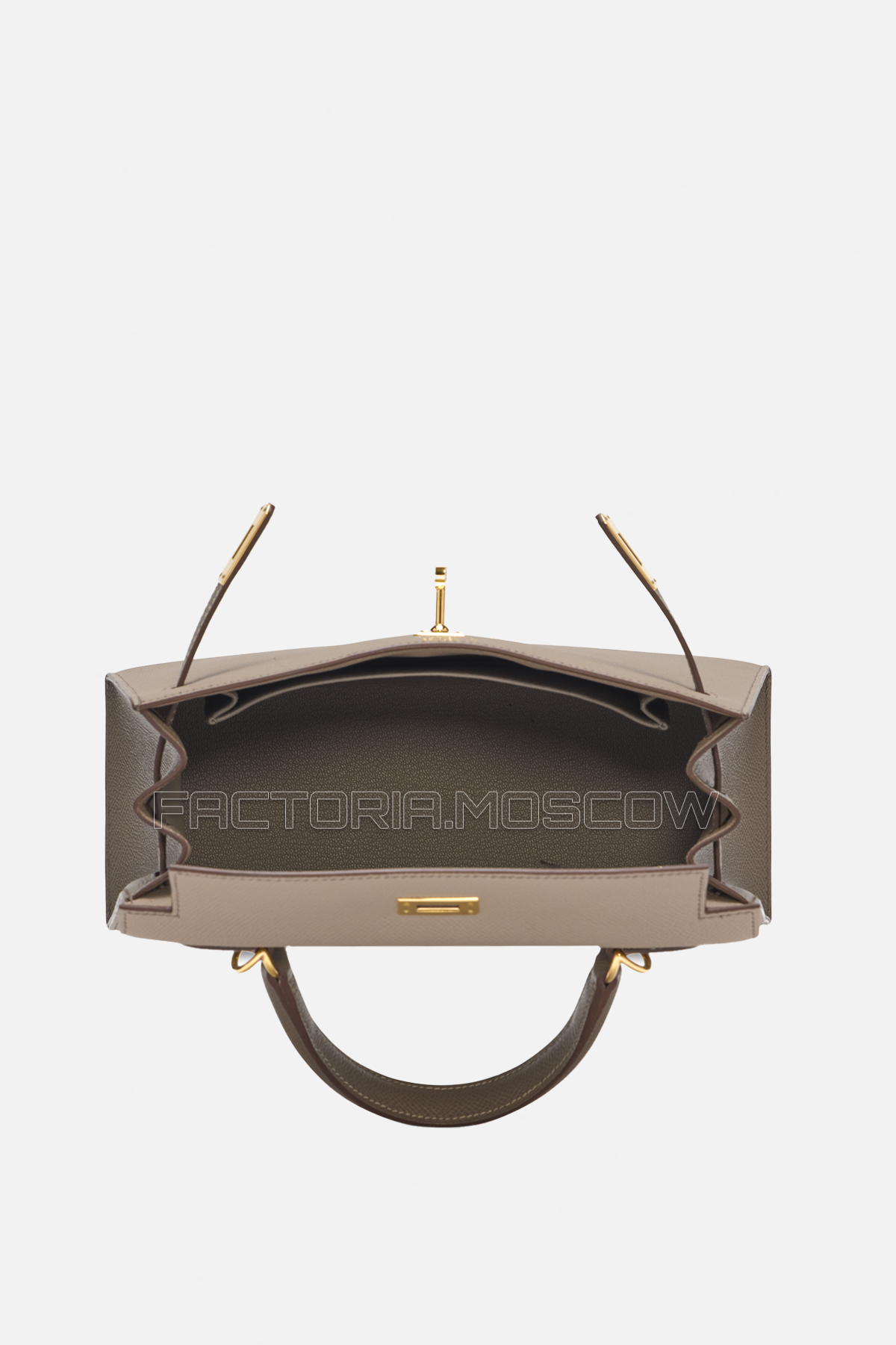 Внутри двухцветной бежево-серой Kelly 25 также исполнена из мягкой кожи козы. Единственное отделение дополнено карманом на молнии и карманами-слотами для хранения мелочей. Снаружи сумку украшает фирменный замок с ключами в кожаном чехле. Размер 25 см демонстрирует изысканность силуэта, вмещая все необходимое.