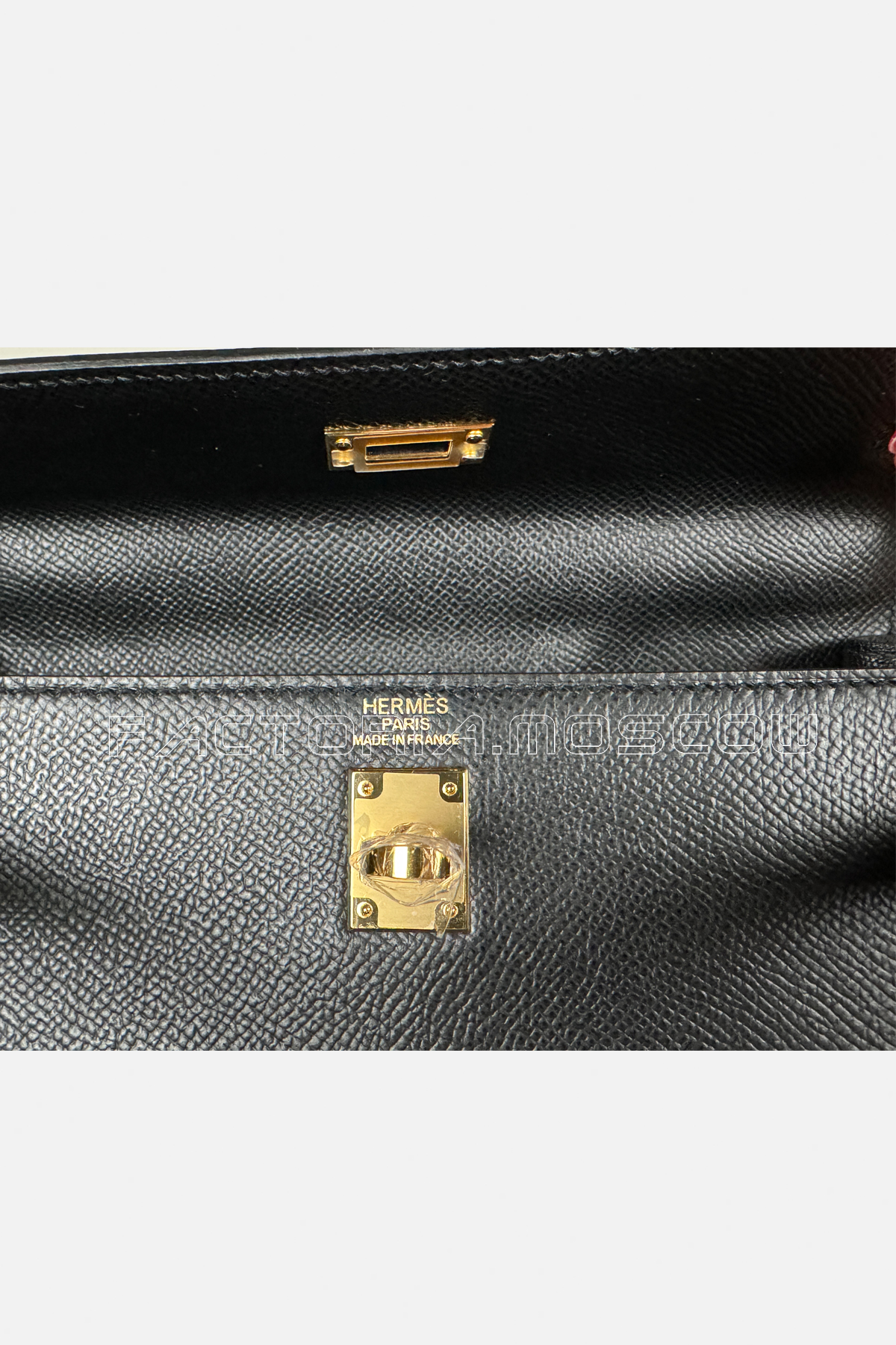 Сумка Hermes Kelly Sellier 25 в клссическом черном цвете Black — это воплощение строгой элегантности, идеальный вариант для тех, кто ценит четкие линии, практичность и вечную актуальность. Сумка Kelly Sellier имеет удобные размеры (25/19/9 см) и трапециевидную форму, одинарную округлую ручку и снабжена съемным плечевым ремнем. У нее толстое дно, сделанное из трех слоев кожи с четырьмя круглыми ножками и верхний клапан, который закрывается на поворотную застежку. Kelly украшена дорогостоящей фурнитурой в узнаваемом стиле, которая придает ей солидность и шарм. Внутреннее отделение сделано в коже Chevre, имеется один карман на молнии и два открытых кармана с противоположной стороны. Вес модели в коже Epsom составляет приблизительно 550-700 грамм. Данная кожа особенно практична и востребована, она жесткая, идеально держит форму Sellier и со временем не деформируется, имеет сдержанный матово-сатиновый блеск.